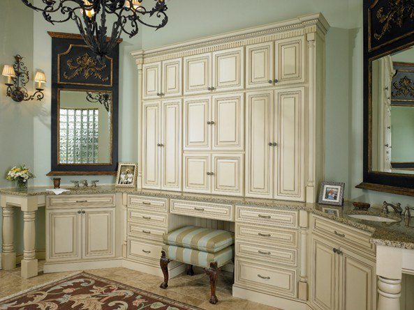 Often these kitchens or the dressing area shown above are designed in painted finishes. If a customer chooses a solid paint color without a glaze, then quality paint stores like Sherwin Williams using the newest high-tech scanners can match the cabinetry finish exactly. Only the application of the paint can give the matching process away, and a good painter with a sprayer will eliminate even that possibility.